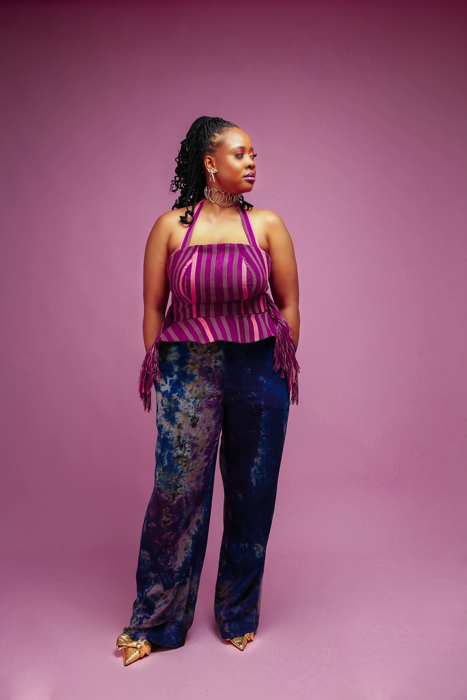 Elevate your wardrobe with the stunning Amara Peplum Halter Top, a striking blend of African-inspired aesthetics and contemporary fashion. Crafted with a structured silhouette, this halter top features vibrant magenta stripes and playful fringe detailing for a bold yet refined look. Paired with the Flow Indigo Palazzo Pants, a luxurious tie-dye creation in rich navy and purple tones, this set is designed for the confident, style-savvy individual who values elegance and versatility.